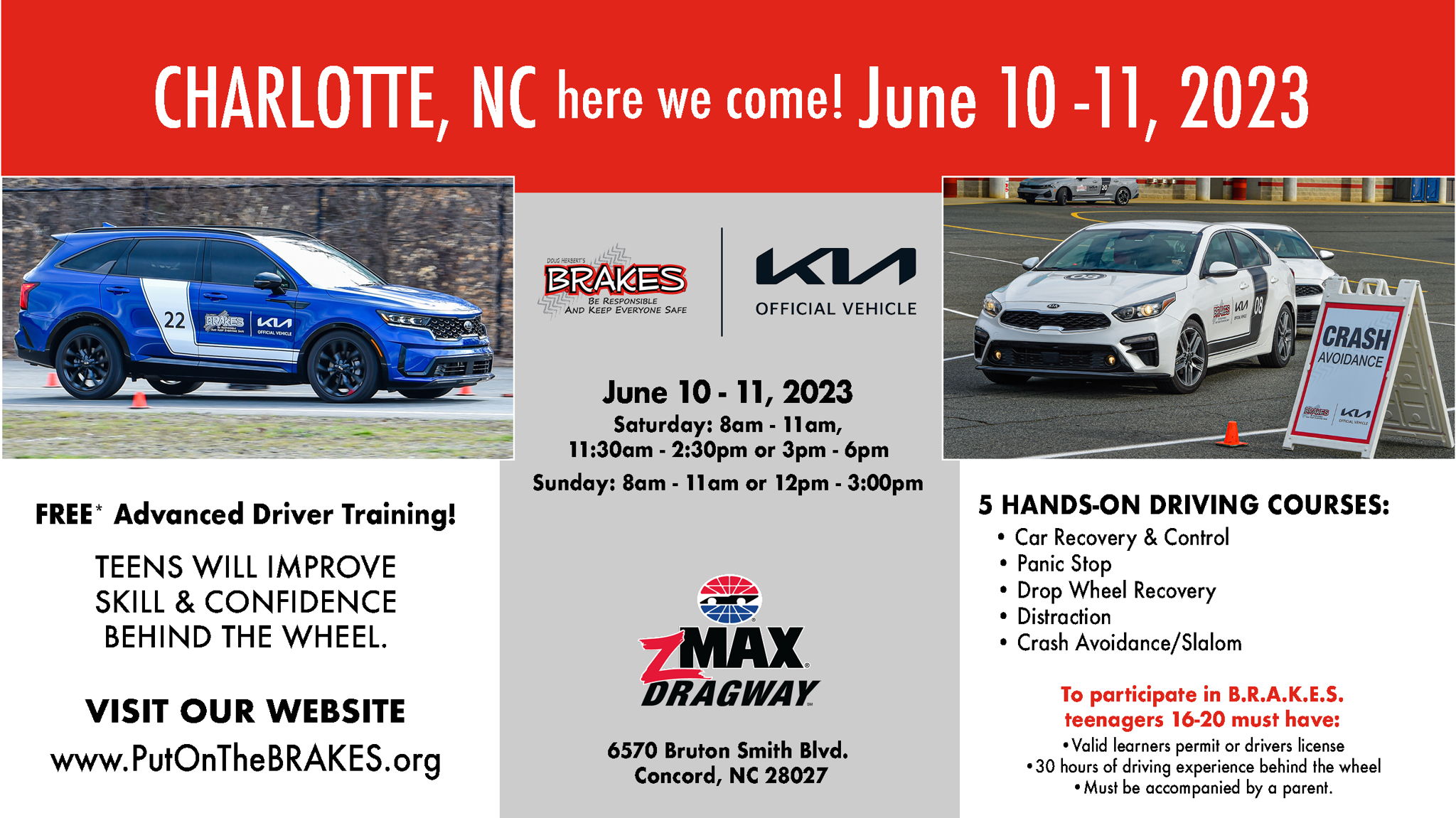 In one 3-hour session, B.R.A.K.E.S. provides teens with extensive behind-the-wheel training in vehicles provided by Kia. Taught by professional instructors--including current and former law enforcement officers and racing drivers-- teens learn distracted driving awareness, panic braking, crash avoidance, drop-wheel/off-road recovery and car control/skid recovery.